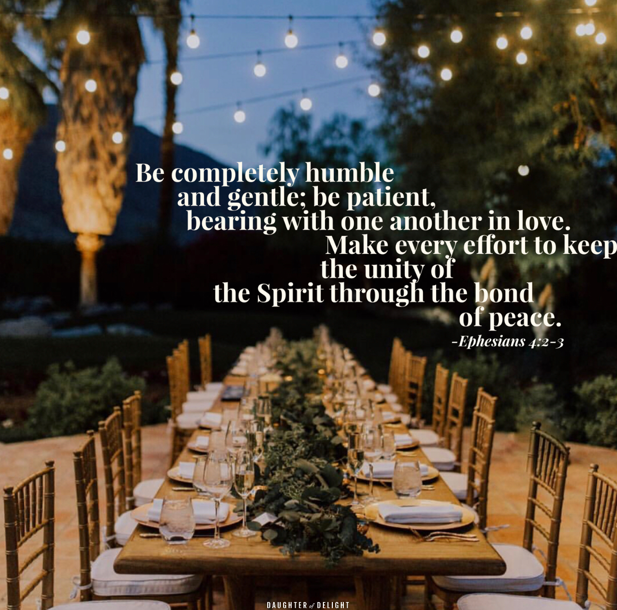 Is the Father’s solution separation? No, the plan to divide and conquer is the plot of the evil one. Instead, our Father calls for humility, gentleness, patience, and forbearance, all wrapped in love. To seek to live peaceably with all and in unity with His Spirit in love is to bless our Father’s heart and bear much fruit (Romans 12:18; Colossians 2:2; Ephesians 4:2-3, NIV).